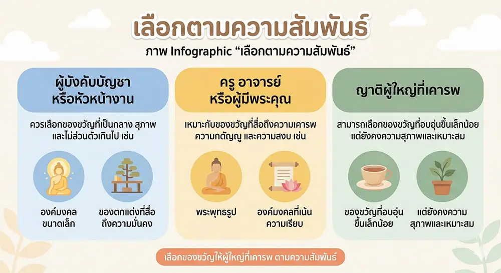 เหมาะกับของขวัญที่สื่อถึงความเคารพ ความกตัญญู และความสงบ เช่น พระพุทธรูปหรือองค์มงคลที่เน้นความเรียบ