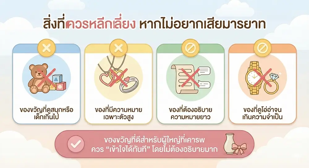 ควรเลือกของขวัญที่เป็นกลาง สุภาพ และไม่ส่วนตัวเกินไป เช่น