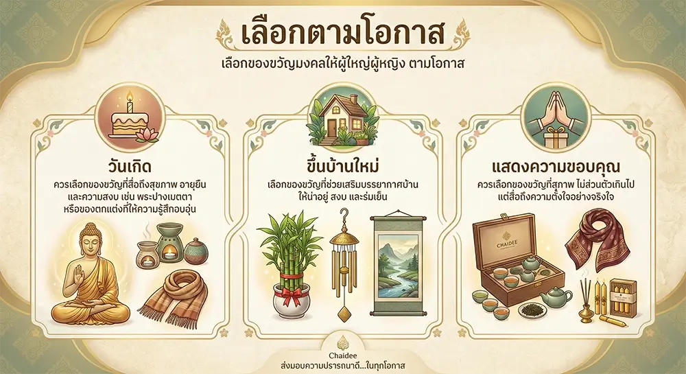 ควรเลือกของขวัญที่สื่อถึงสุขภาพ อายุยืน และความสงบ เช่น พระปางเมตตา หรือของตกแต่งที่ให้ความรู้สึกอบอุ่น
