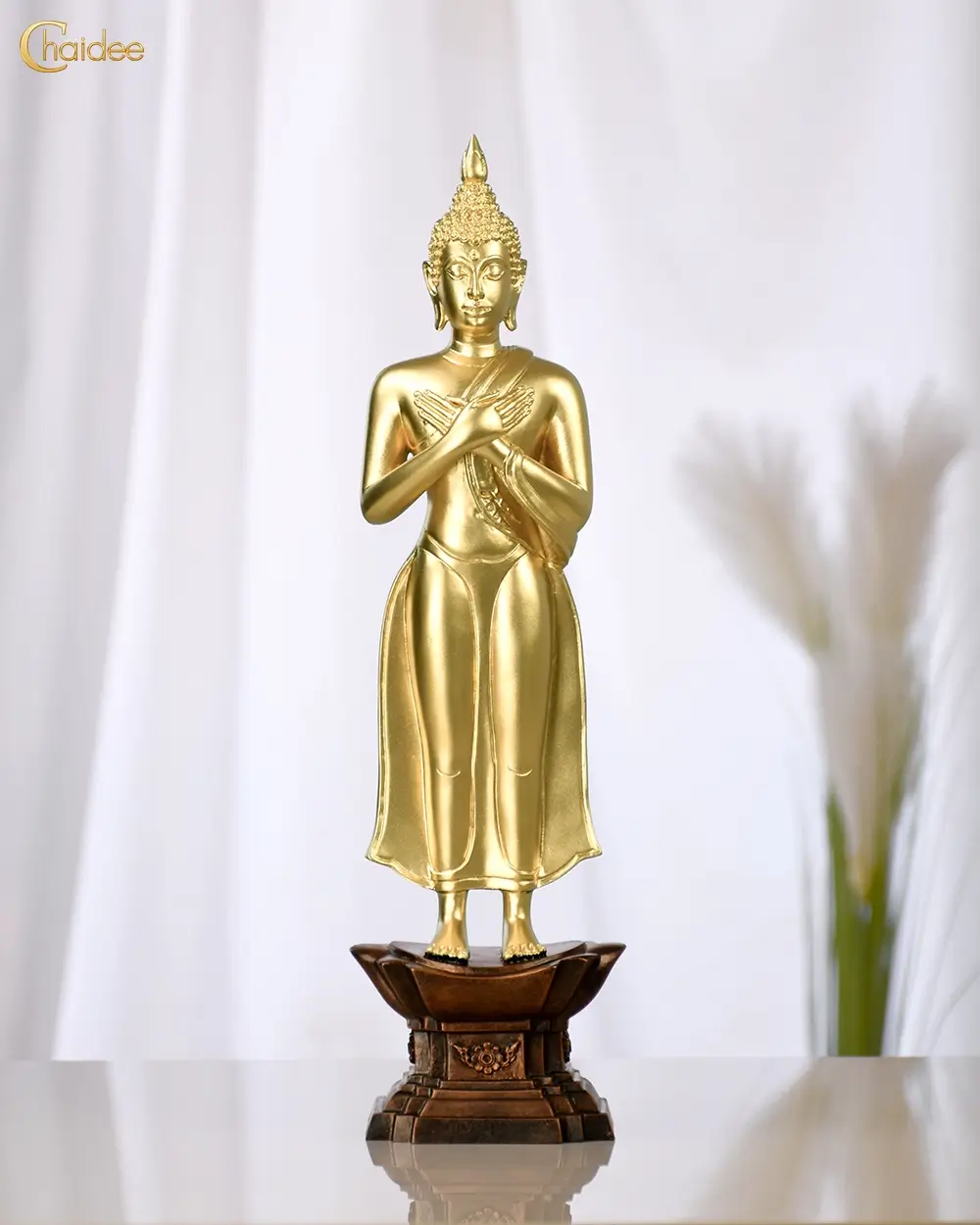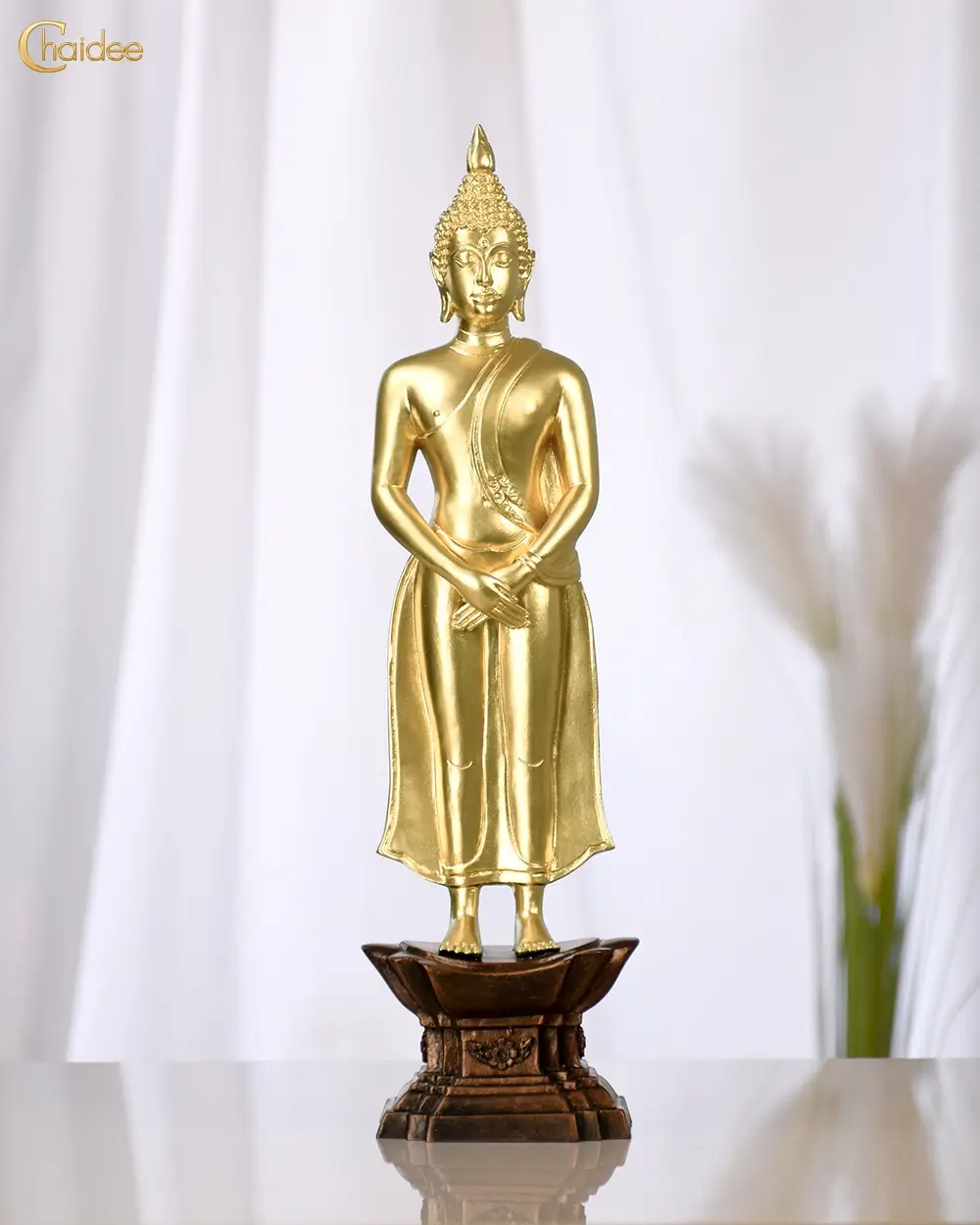 พระพุทธรูปปางถวายเนตร พระอิริยาบถอยู่ในลักษณะประทับยืน พระหัตถ์ทั้งสองห้อยลงมาประสานกัน