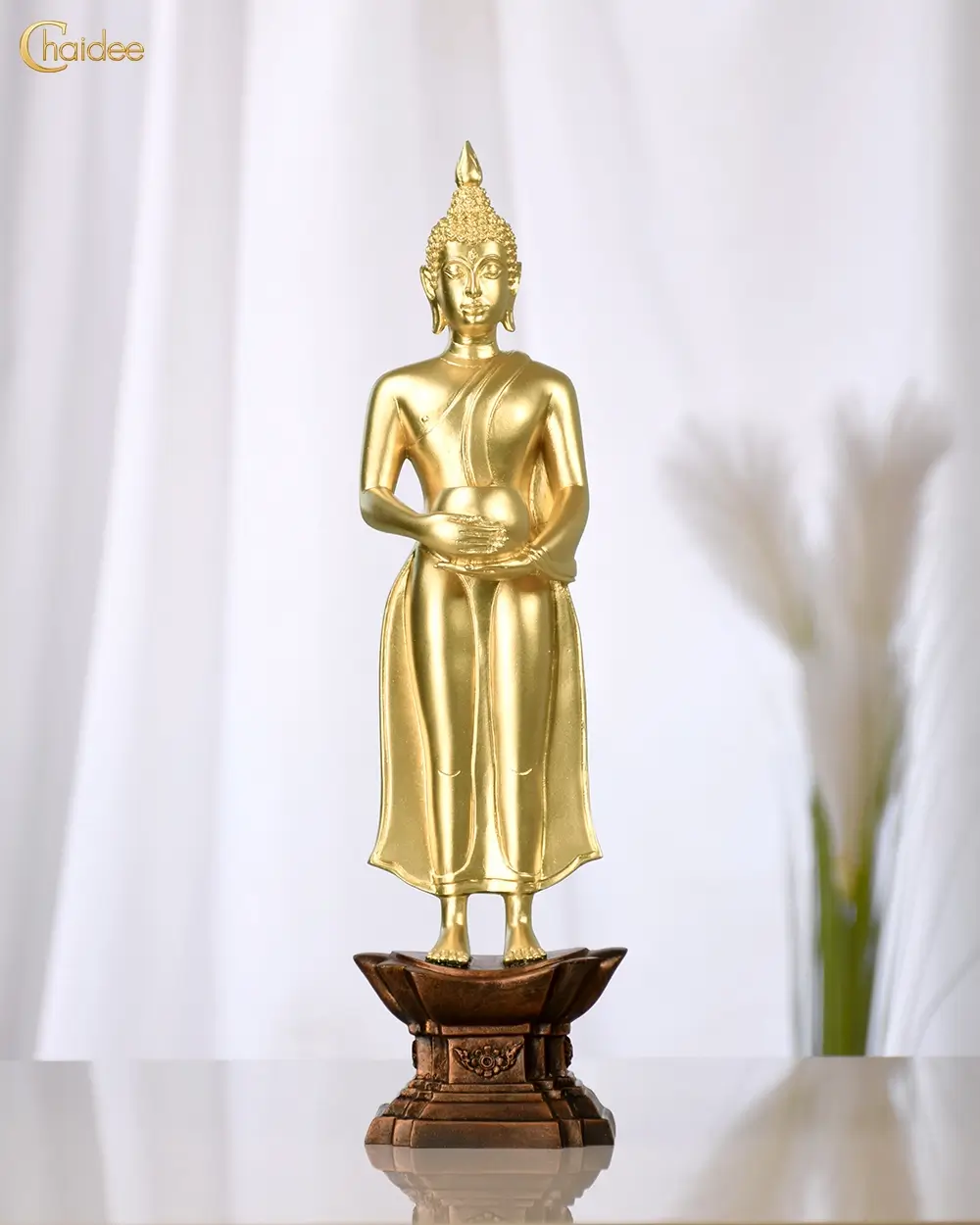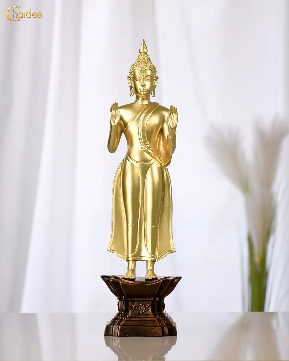 ทรงอยู่ในอาการสังวร พระเนตรเพ่งไปข้างหน้า มาจากเรื่องราวในพุทธประวัติกล่าว่าที่ หลังจากพระพุทธเจ้าตรัสรู้ได้เสด็จมาประทับยืนทางทิศตะวันออกเฉียงเหนือของต้นพระศรีมหาโพธิ์ และเพ่งมองต้นพระศรีมหาโพธิเป็นเวลา
