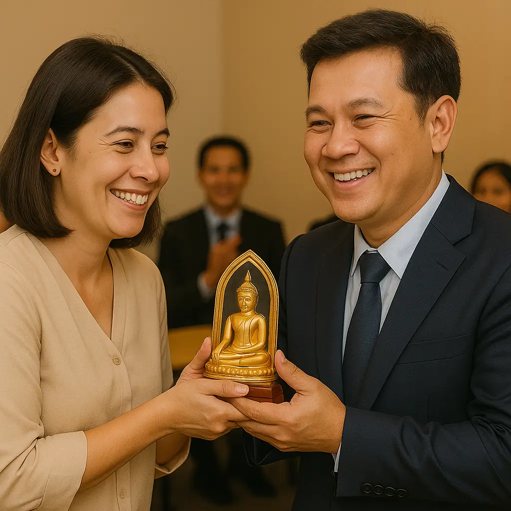 เลือกของที่มีความเรียบหรู เช่น องค์เทพ กรอบพระ หรือผลงานศิลป์มงคล ที่เหมาะสมกับภาพลักษณ์ของหัวหน้าในตำแหน่งใหม่